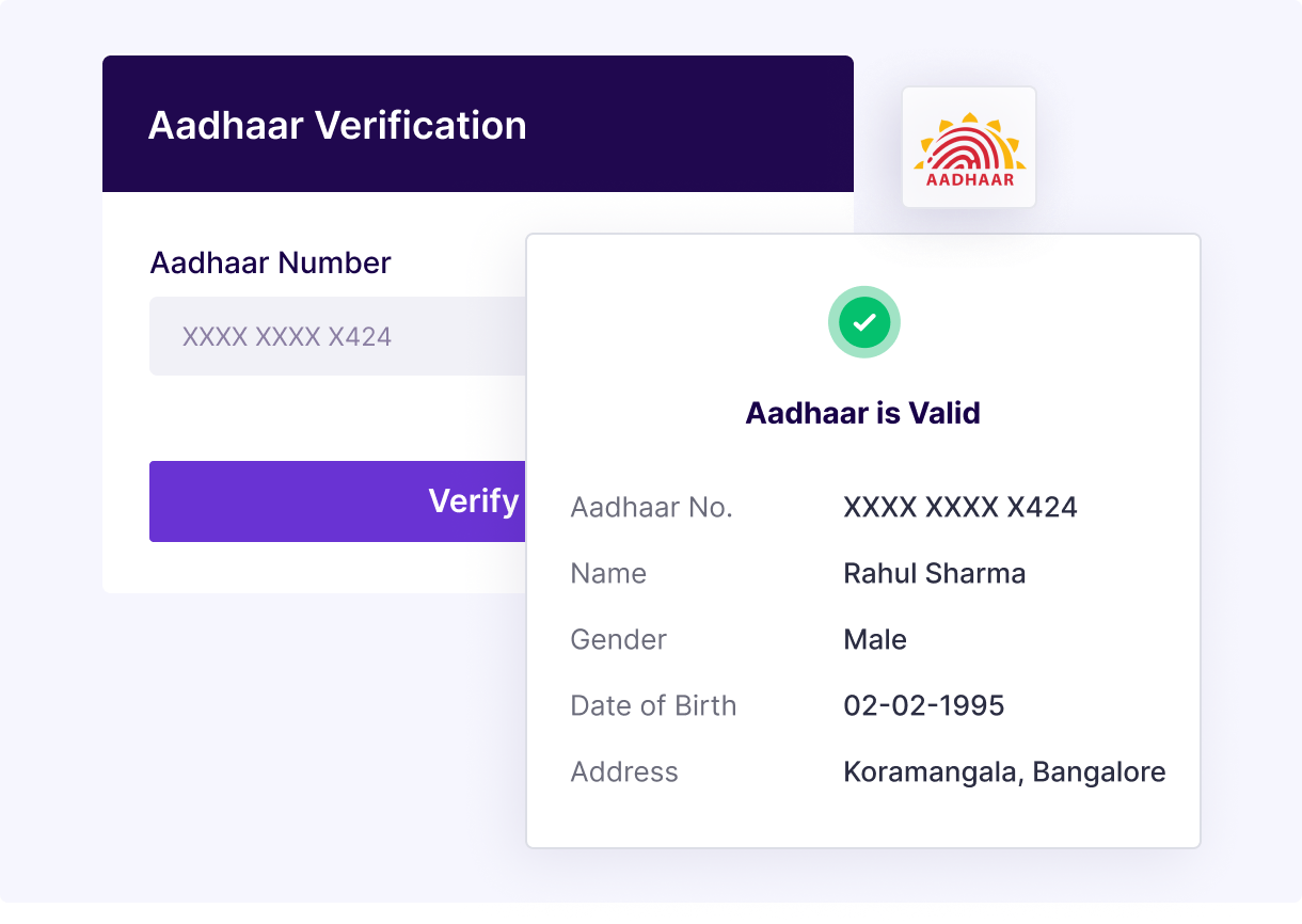 Instantly verify Aadhaar details of users with consent-based verification flow.